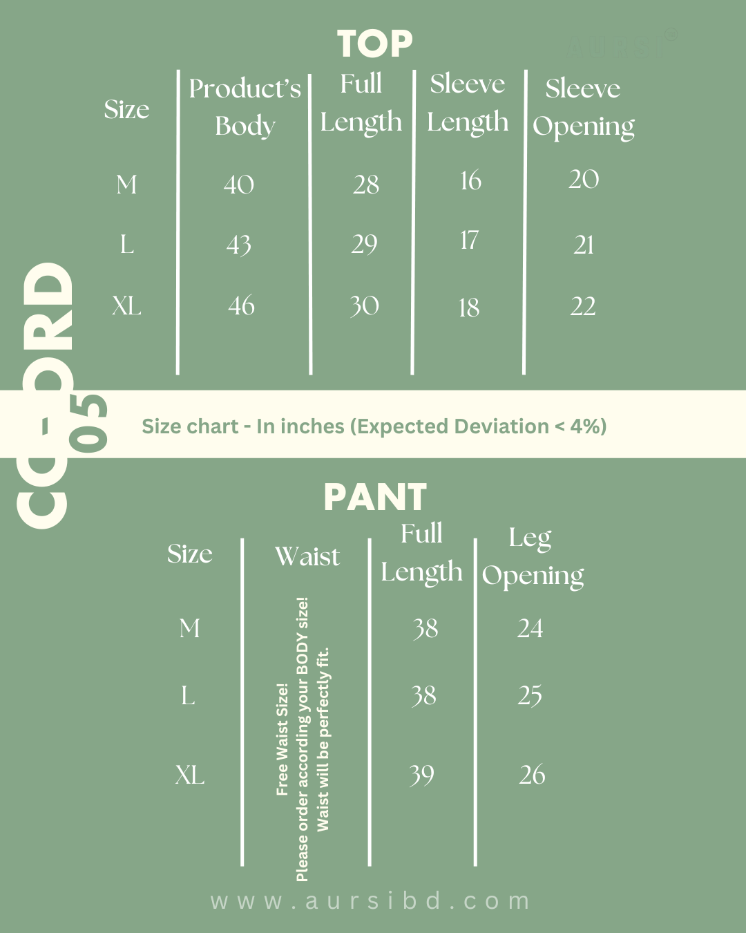 {Size chart - In inches (Expected Deviation < 4%)}